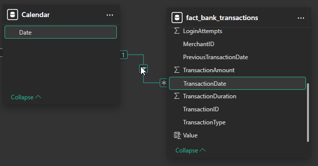 Consider the following tables and 1-* relationship ('Calendar'[Date] - 'fact_bank_transactional'[timestamp]):